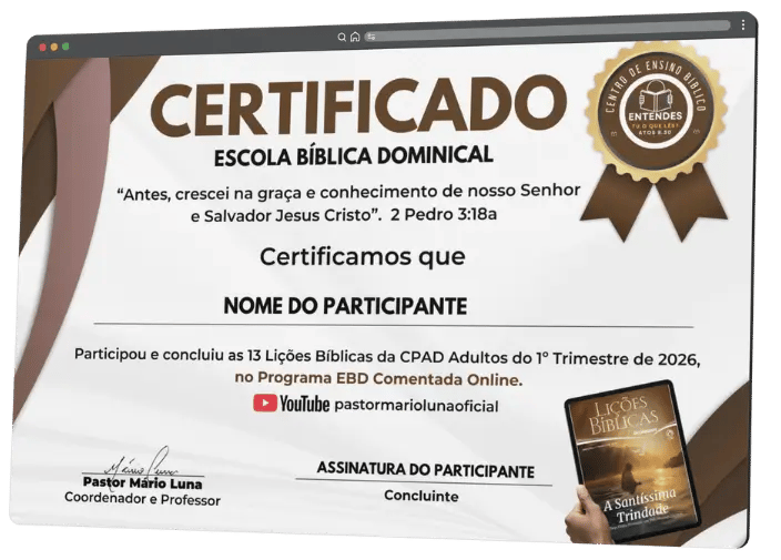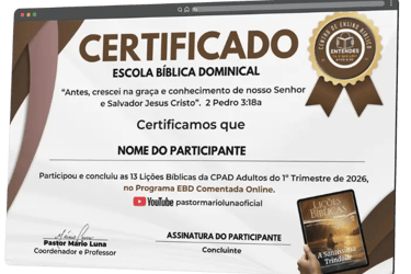 Ao concluir as 13 Lições da CPAD Adultos (1º Trimestre de 2026) pelo material de apoio do EBD Comentada Online, você poderá baixar um certificado gratuito diretamente de sua área restrita.