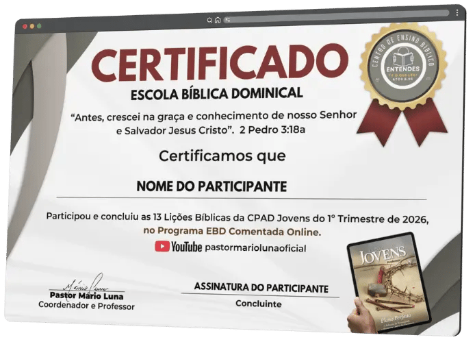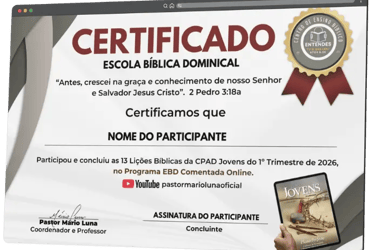Ao concluir as 13 Lições da CPAD Jovens (1º Trimestre de 2026) pelo material de apoio do EBD Comentada Online, você poderá baixar um certificado gratuito diretamente de sua área restrita.